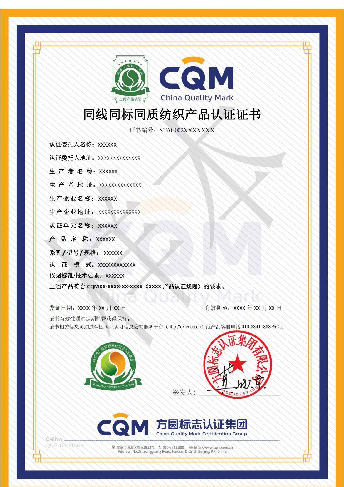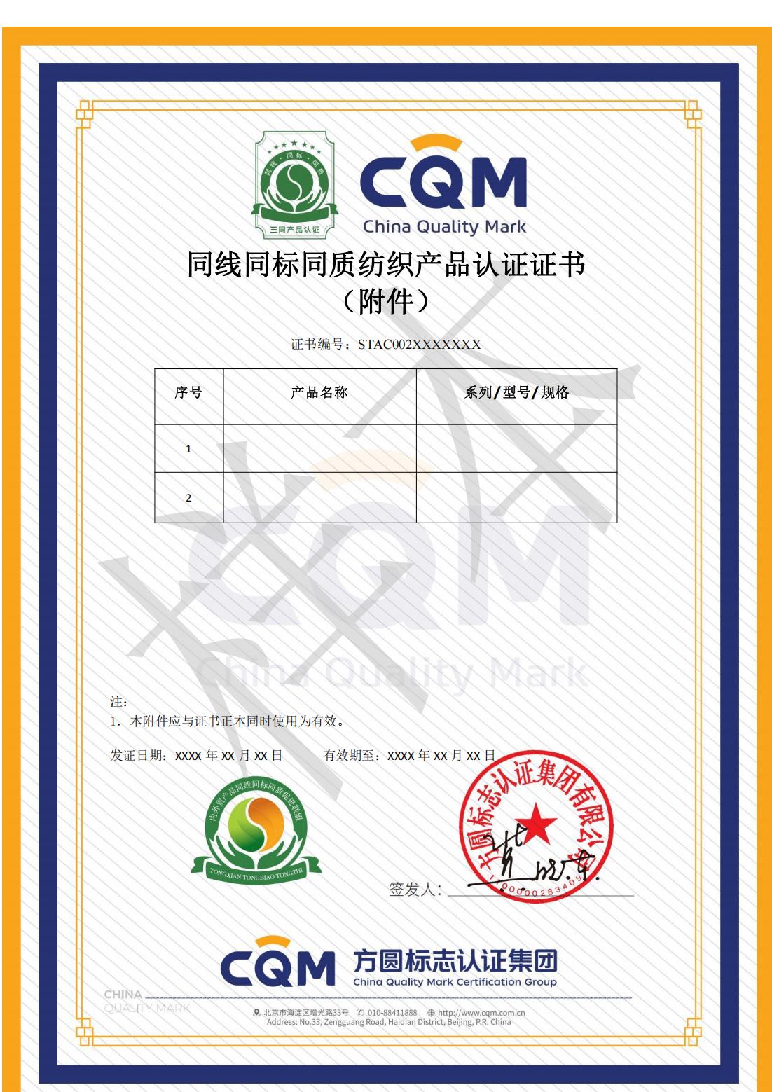 1. 同線同標(biāo)同質(zhì)紡織品產(chǎn)品認(rèn)證證書:
