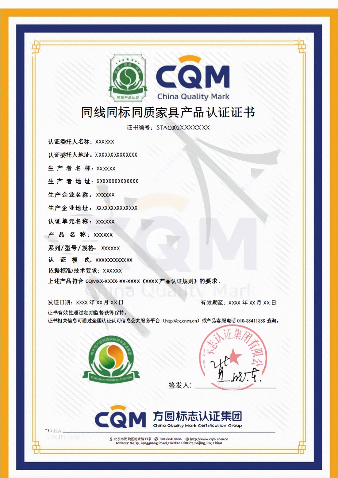 2. 同線同標(biāo)同質(zhì)家具產(chǎn)品認(rèn)證證書:
